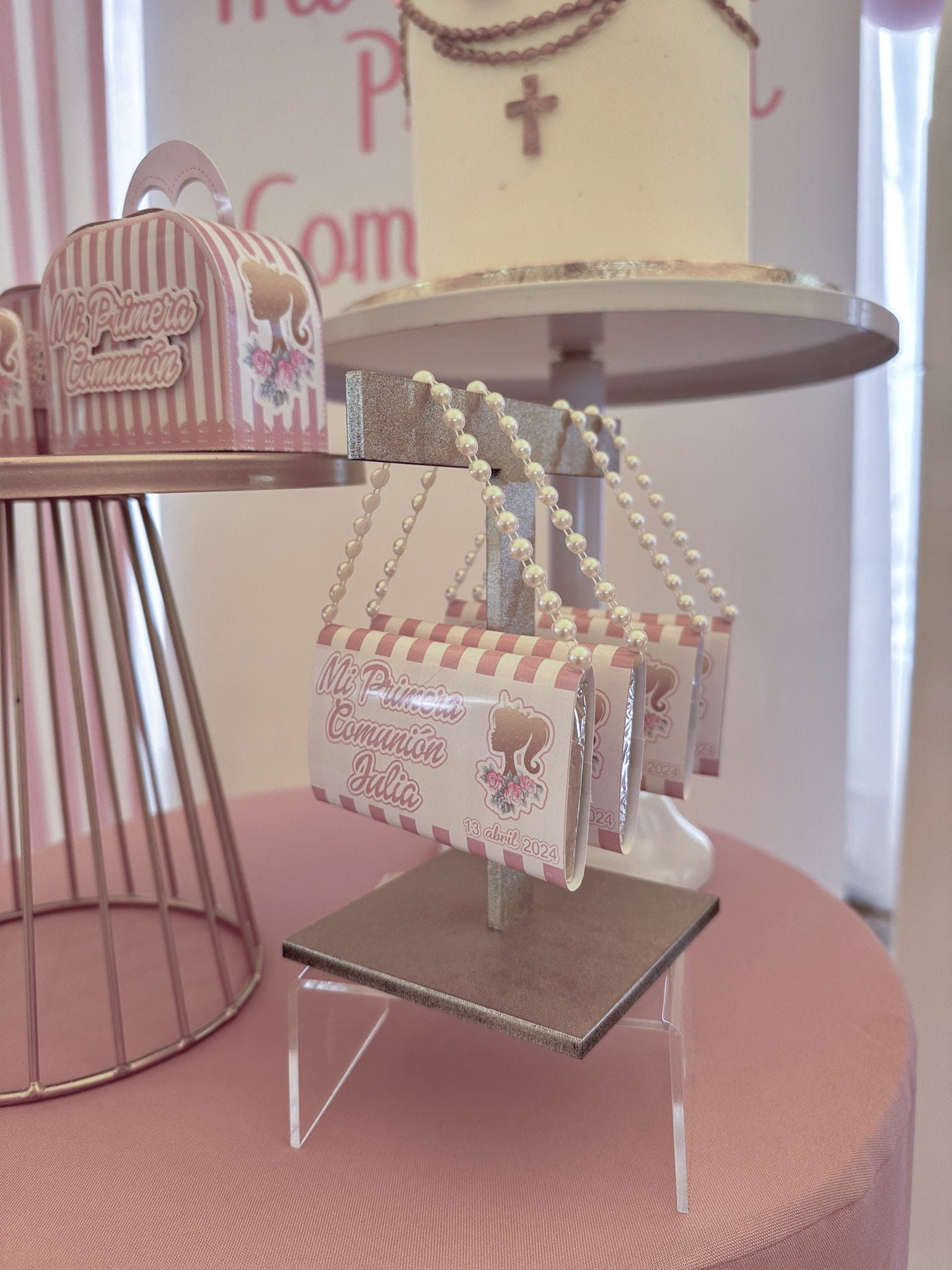 Se puede ser más glamuroso que estás pringles?? Y el tocador con los botes personalizados para nuestra anfitriona 💖 por no decir de las chocolatinas en forma de bolsitos…. No faltó un detalle en la comunión de Julia, juzguen vosotros mismos 😉